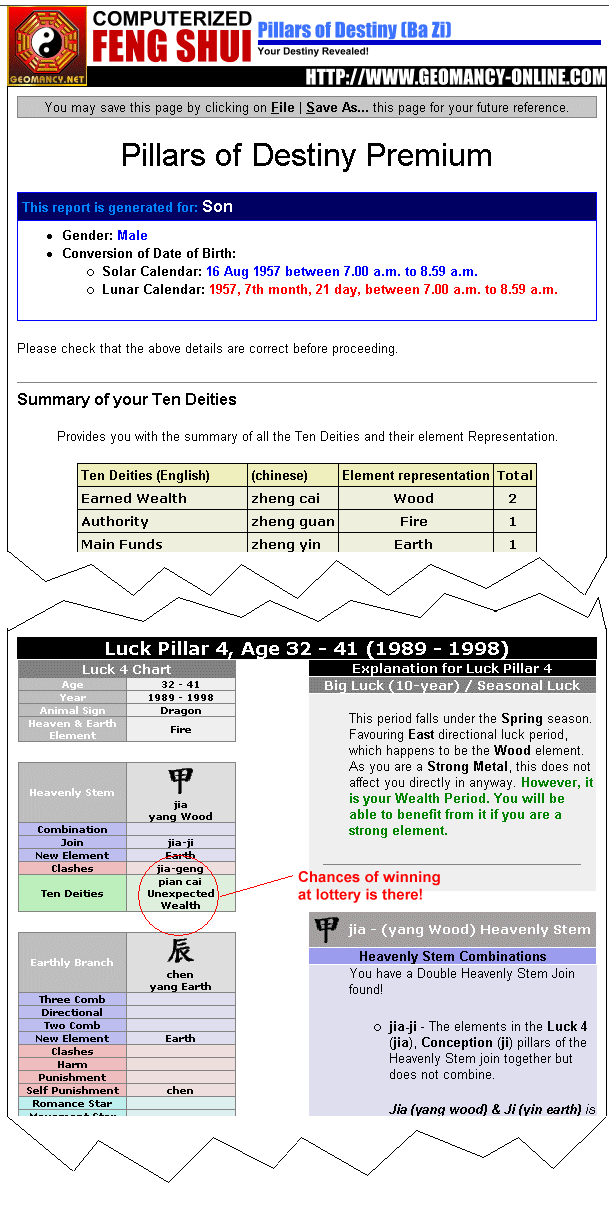 Yes, this also comes standard in all our on-site audits. You also get a bonus, your detailed individual family's full Ba Zi (Eight Characters) report will provide you with a glimpse as to whether you or your family members have (A) unexpected wealth (pian cai) and or(B) unexpected funds (pian yin) as shown below:-