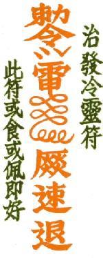 3.3 If a person has a fever (alternate hot and cold) and the illness gets worse, burn the paper, put the ashes into the water and drink it. Alternatively, carry the charm in a pocket or hang it round the neck with a string:-